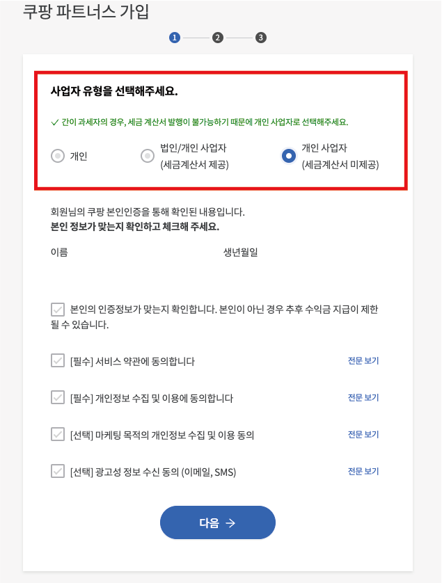 쿠팡파트너스에 가입할 때 "개인"과 "사업자(개인사업자·법인)" 중 하나를 선택해야 합니다.
